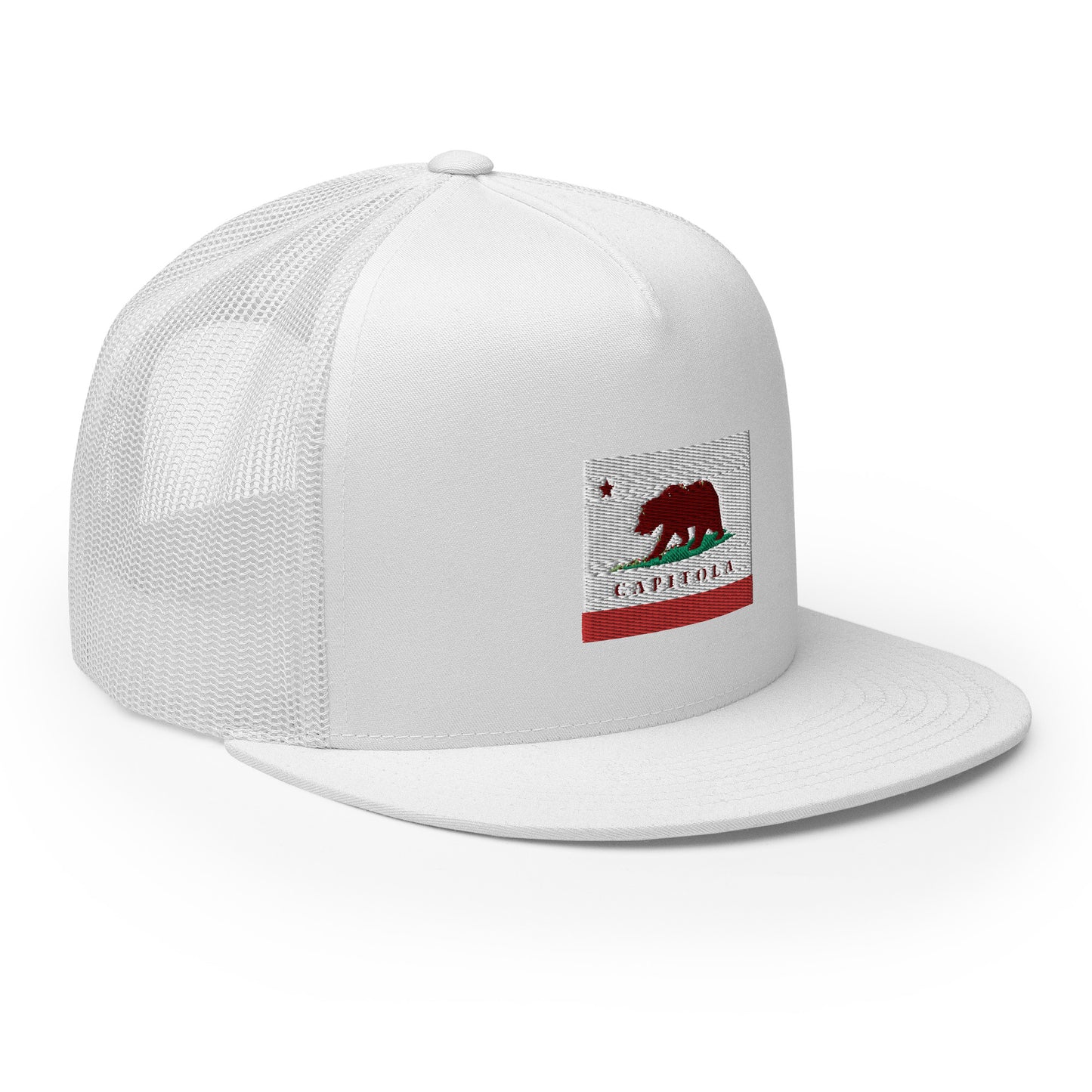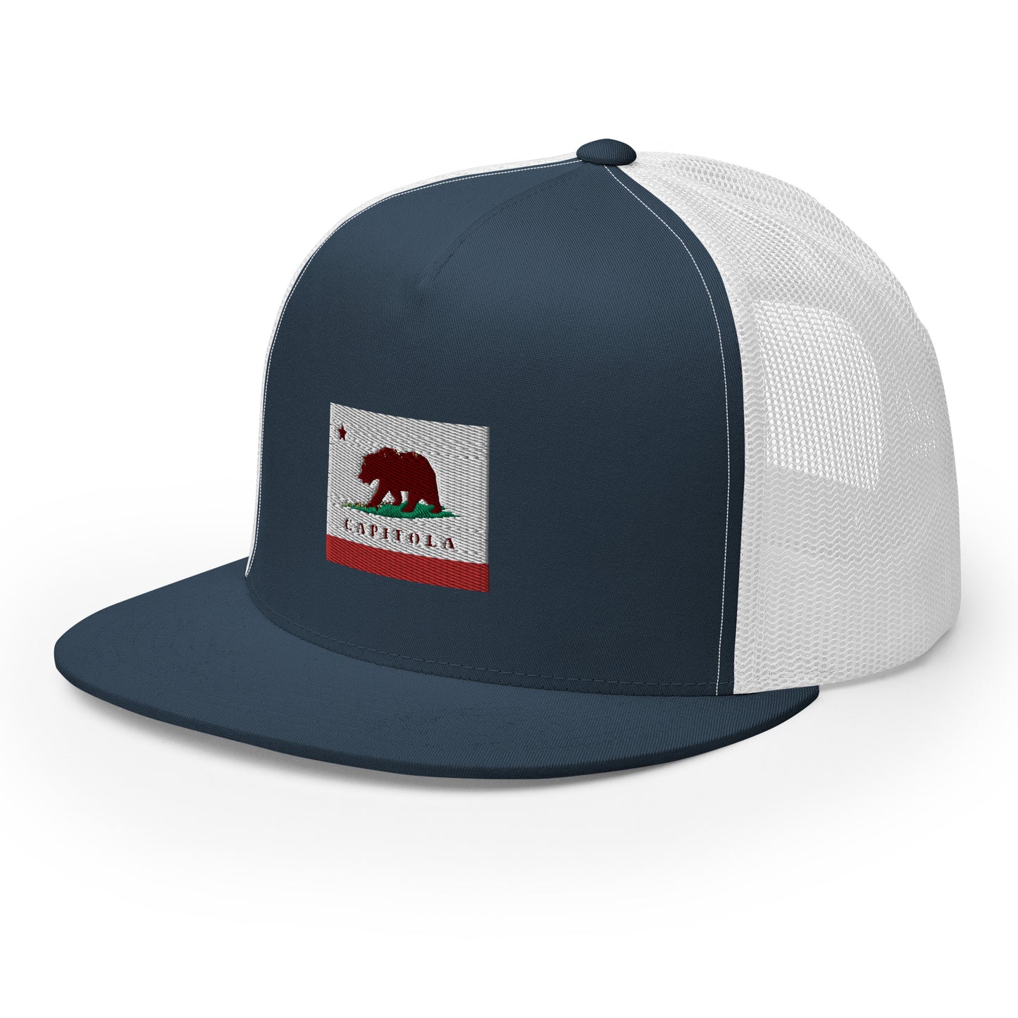 Classic trucker style with a cool fabric blend and Capitola CA flag design.
