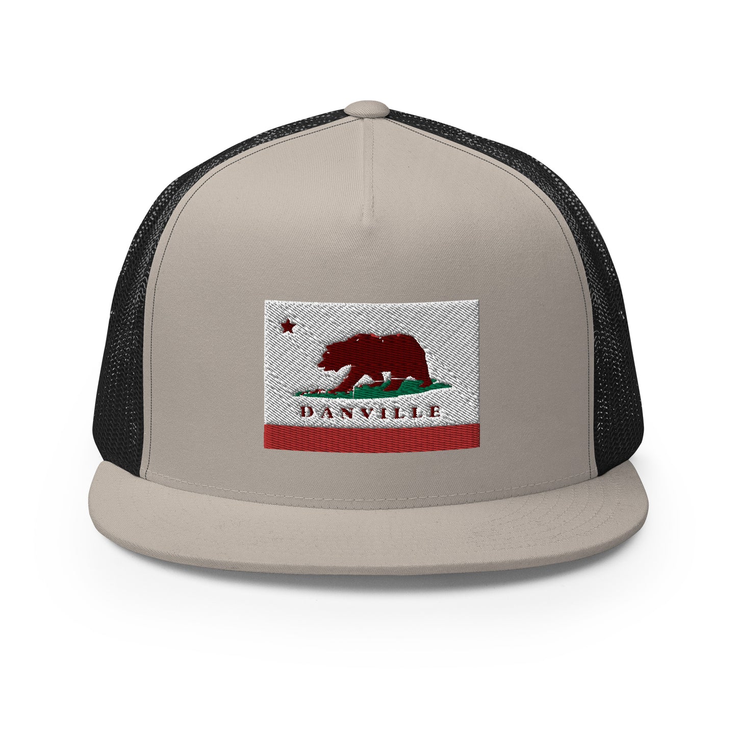 Classic trucker cap style with a cool fabric blend and Danville CA flag with golden grizzly.