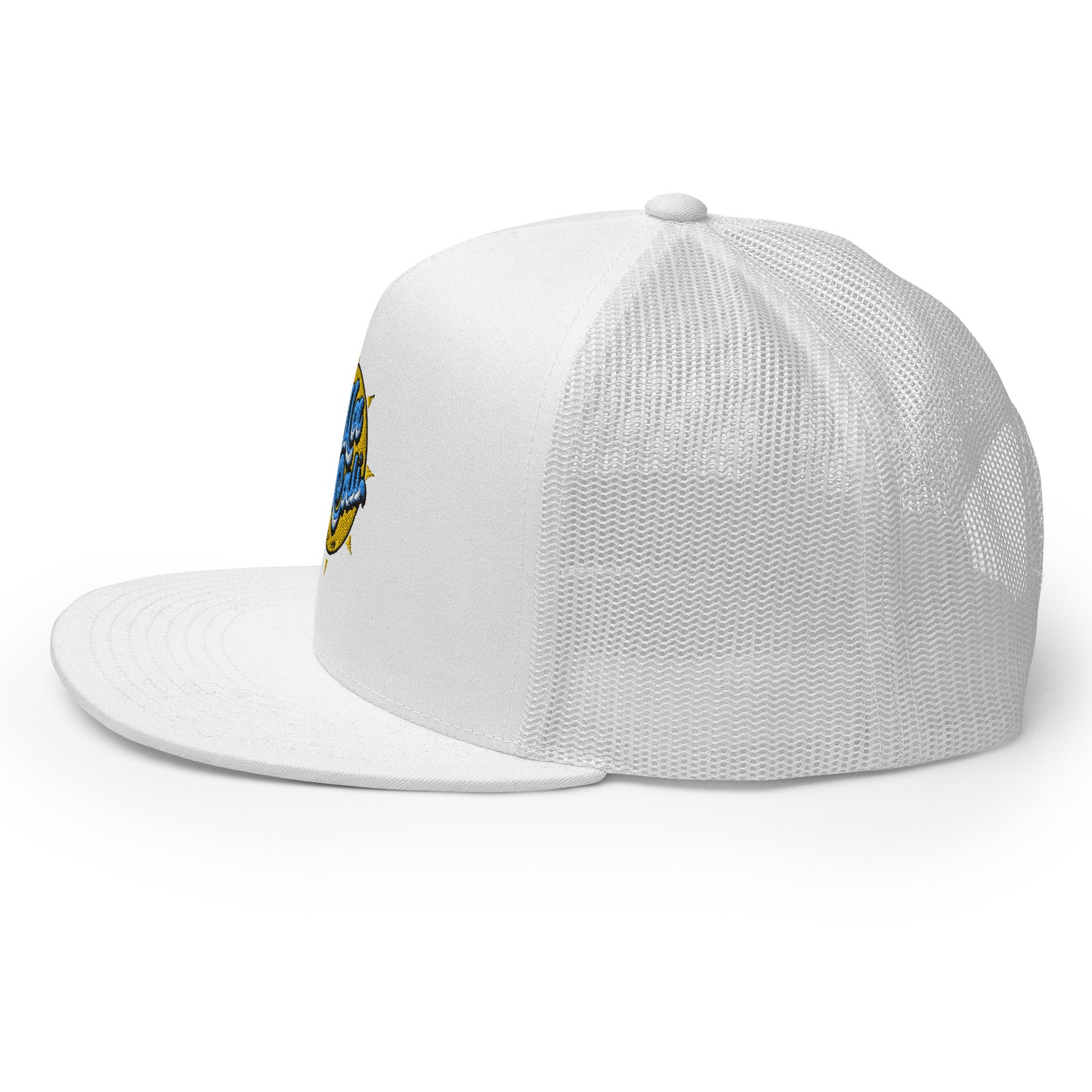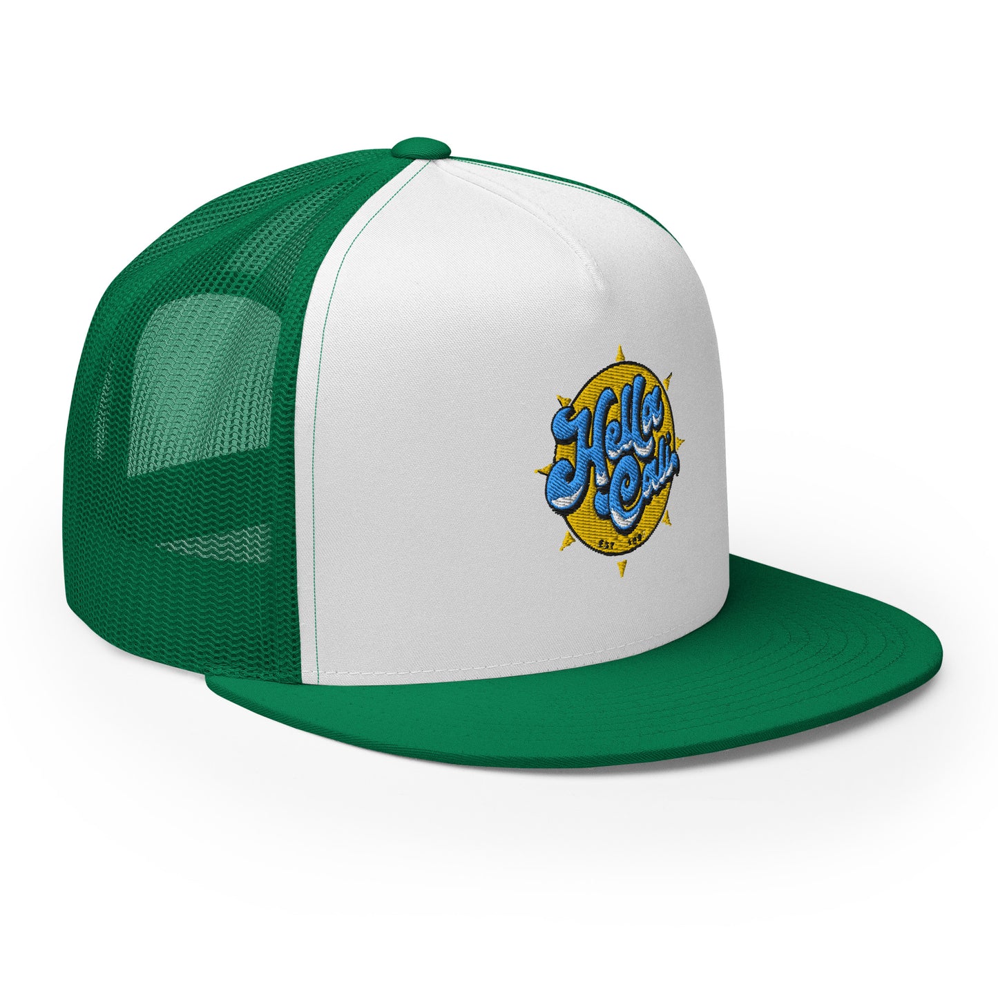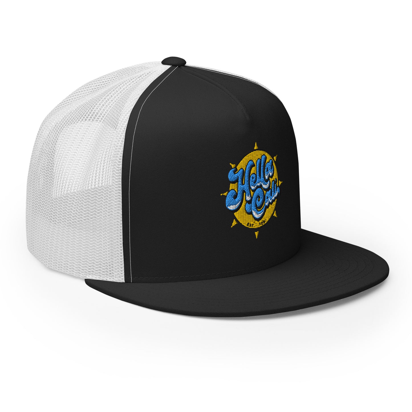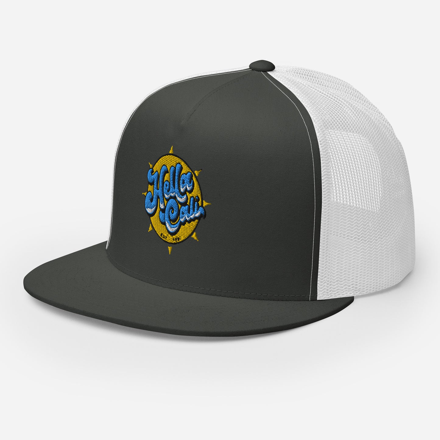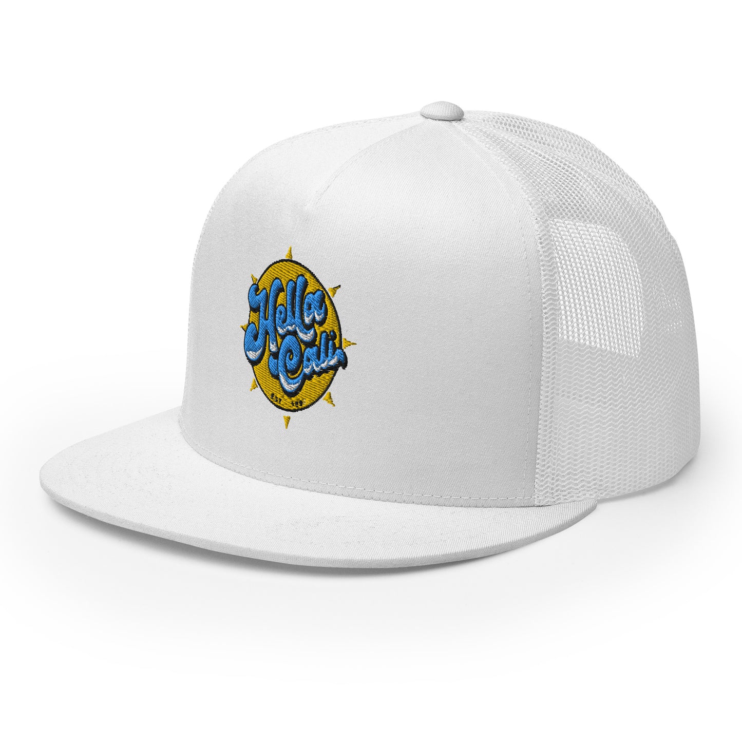 Hella Cali classic trucker cap style with cool fabric blend, yellow sun and blue lettering.